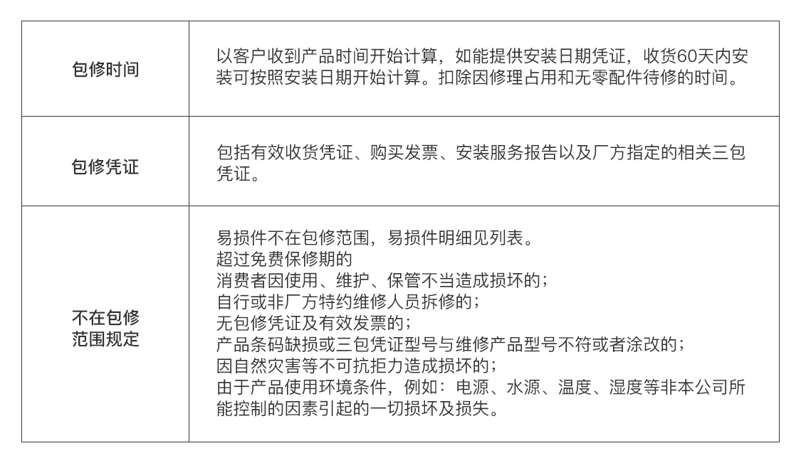 公司根据《中华人民共和国消费者权益保护法》,《中华人民共和国产品质量法》以及《部分商品修理更换退货责任规定》的有关要求,本企业对产品包修规定如下:
