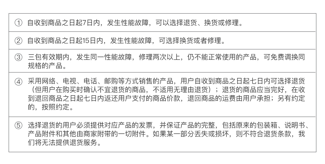 2、产品退换货时,如符合收取折旧费条件,按约定收取费用。由于商品的不同,其他服务政策略有差异,在实施细则上,如包修操作、售后服务、技术支持等方面为您提供服务可能会所差异;所有包修规定均以国家《三包条例》为准则,如本说明和《三包规定》相冲突之处,以《三包条例》为准